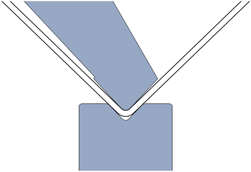 - лист полностью прижимается к наконечнику пуансона и V-раскрытию матрицы,
