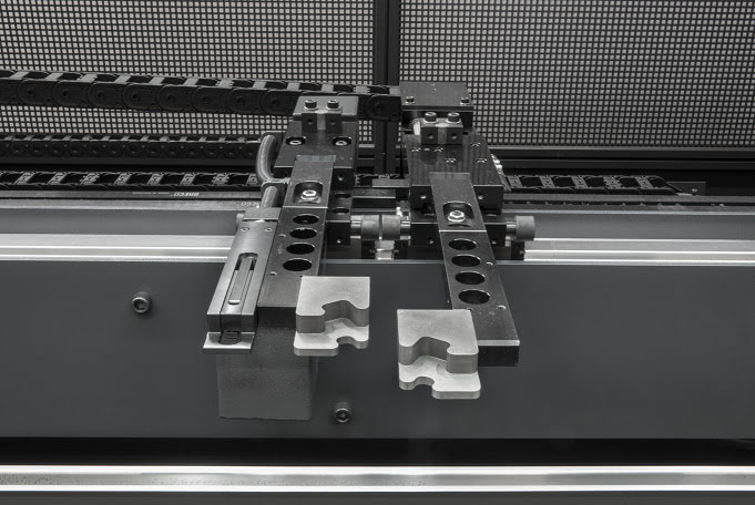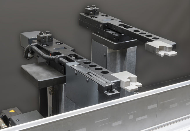 5-осевые задние упоры оснащаются наконечниками особой формы. Они позволяют базировать детали под углом к линии гиба. Боковые контактные поверхности упоров могут служить базовыми точками по оси Z. Это упрощает позиционирование деталей.
