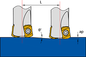 | Максимальный угол врезания θ (°) | Максимальная глубина резания a p (мм) | Минимальная длина врезания при максимальной глубине резания (a p ) L (мм) | HD min (мм) | HD max (мм) | ||