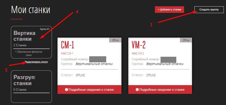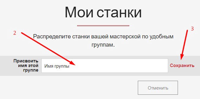 На странице «Мои станки» нажмите «Создать группу» [1].