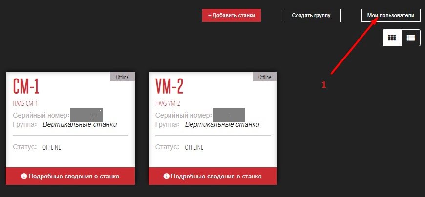 На странице «Мои станки» нажмите «Мои пользователи» [1].