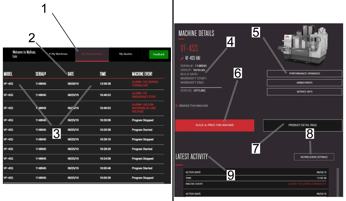 На странице «Мои станки» нажмите « Мой HaasConnect » [1].