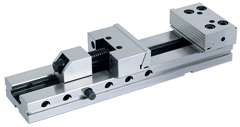 Прецизионные станочные тиски используются для высокоточной обработки деталей на фрезерных станках и обрабатывающих центрах. Конструкция тисков состоит из основания и двух прижимных блоков с подвижными и неподвижными губками, которые обеспечивают быстрое и надежное крепление заготовки. Благодаря модульной конструкции тисков можно при необходимости производить замену блоков или менять их положение. Прецизионные тиски имеют быстрозажимную систему заготовки: на основании тисов имеется ряд отверстий, с помощью которых можно регулировать подвижную часть губок под габариты детали, фиксация подвижной губки осуществляется с помощью штифта, а затем дотягивается винтом до жесткого крепления заготовки. Тисы изготовлены из высококачественной стали, твердость рабочей поверхности составляет 58 - 62 HRC. Параллельность - 0.005 мм/100 мм, перпендикулярность 0,005 мм; Ширина губок - 150 мм; Рабочий ход - 300 мм; Длина основания - 520 мм;